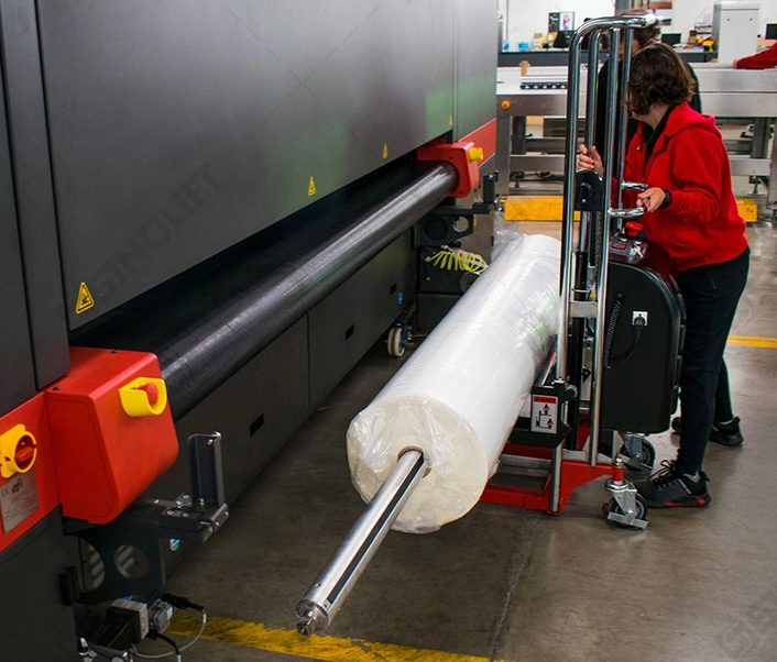 Once you reach the printer or textile machine, raise the roll to the exact height of the spindle. The controlled lifting mechanism (whether via foot pump or electric button) allows for minute adjustments. Once the roll is aligned, gently slide it onto the machine’s shaft. Many lifters are designed to fit partially under the machine frame, allowing for a “gapless” transfer.